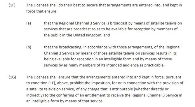 The Channel 3 broadcast is explicit over the requirement that ITV1 must be available via satellite and without charge.